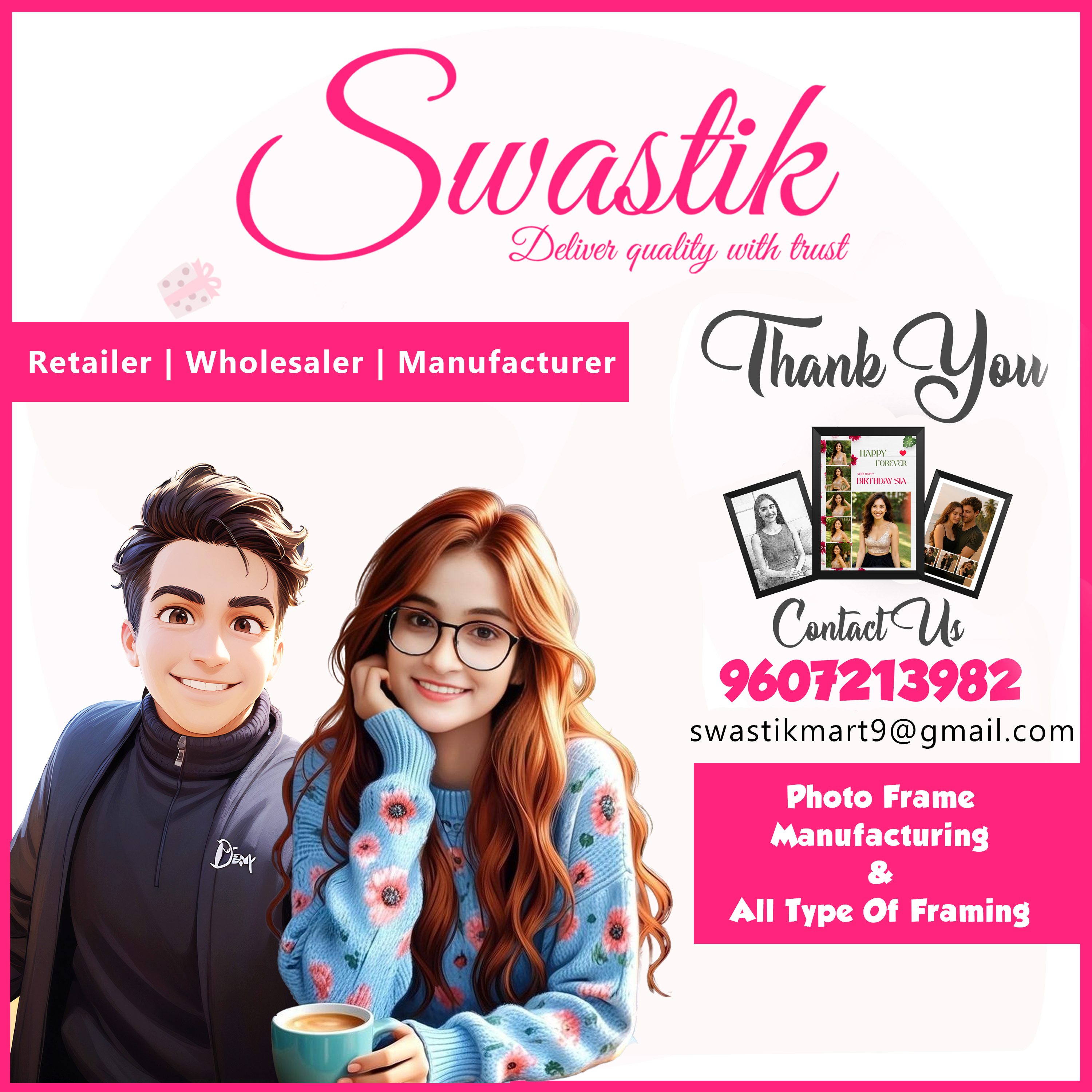 Welcome to Swastik-Mart Your One-Stop Shop for Customized Photo Frames At Swastik-Mart, we specialize in selling high-quality customized photo frames perfect for every occasion. Our handcrafted frames are available online on Meesho, Flipkart, and Amazon, making it easy for you to order from the comfort of your home.